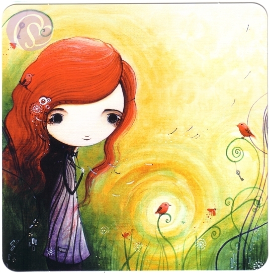 Postkarte Mädchen mit Vögeln[JW_BU08]Quadratische Postkarte mit runden Ecken ~ partieller Glanzlack |