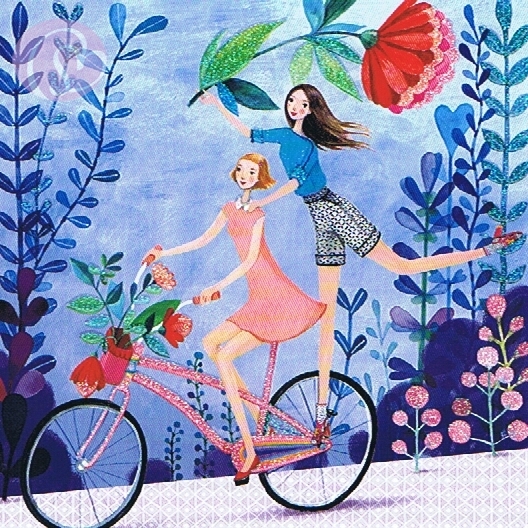 Postkarte Freundinnen auf dem Fahrrad[EGMM12-1623]Quadratische Postkarte ~ Glimmerlack |