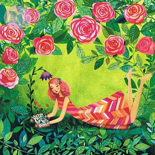 Postkarte Lesendes Mädchen im Rosengarten[EGMM12-1619]Quadratische Postkarte ~ Glimmerlack |