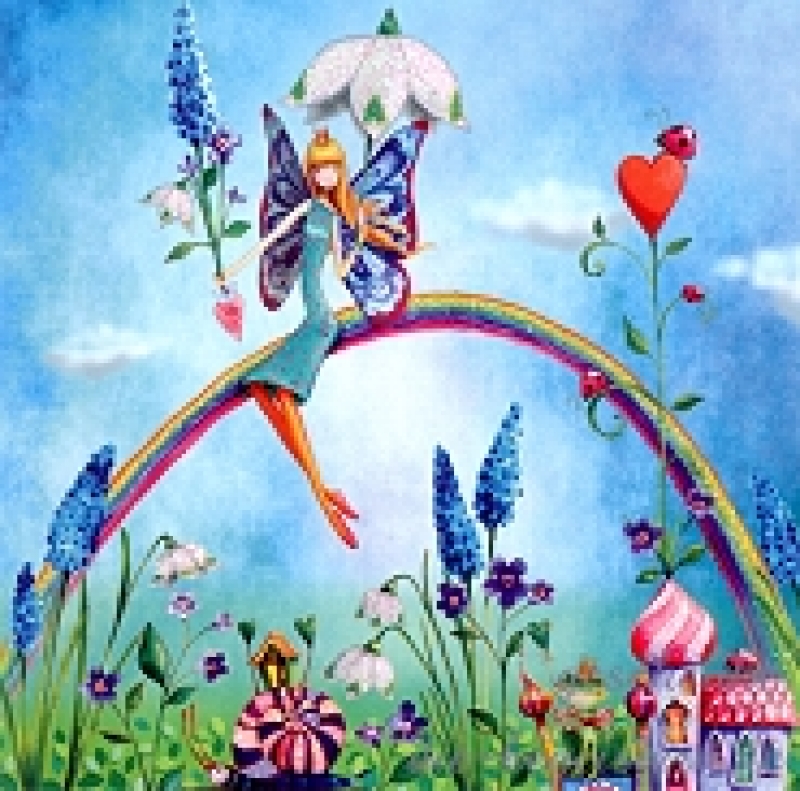 Postkarte Elfe auf Regenbogen[EGMM12-1090]Quadratische Postkarte ~ Glimmerlack |