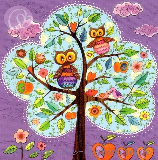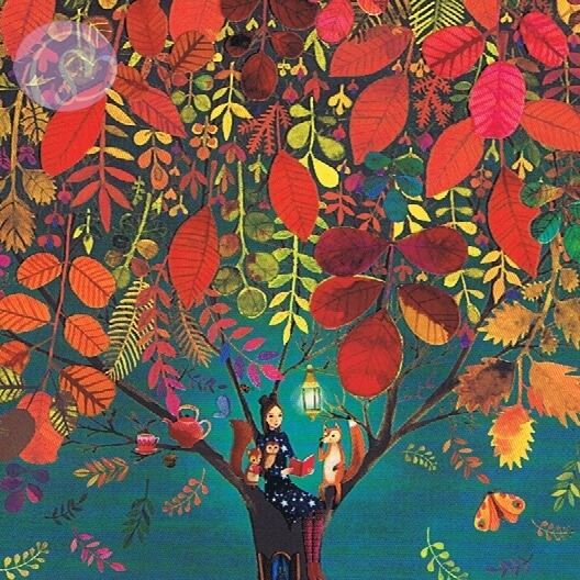 Postkarte Mädchen mit Tieren im Baum[EGMM12-1637]Quadratische Postkarte ~ Glanzlack |