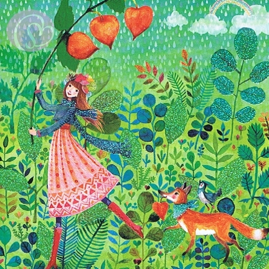 Postkarte Mädchen mit Lampionblumen[EGMM12-1638]Quadratische Postkarte ~ Glimmerlack |