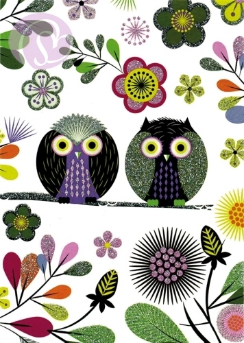 Postkarte Elegant Owls, weiß[RLBPC037]10,5 * 14,8 cm (DIN A6) ~ Glimmerlack