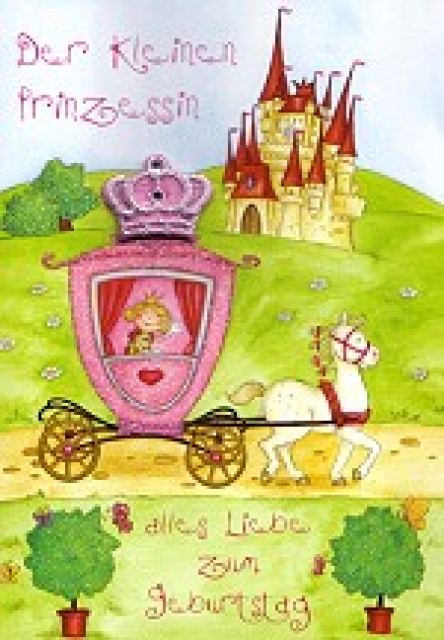 Klappkarte Geburtstag, Kutsche[EG1-12581]Doppelkarte mit Umschlag (pink) ~ Applikation: Stoff-Sticker-Krone und Glimmerlack |