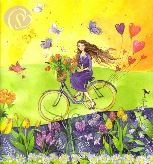 Postkarte Mädchen auf Fahhrad[TCKH-50-311]Quadratische Postkarte ~ mit Glimmerlack
