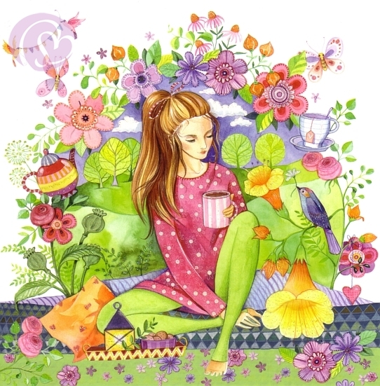 Postkarte Mädchen mit Teetasse[TCKH-50-280]Quadratische Postkarte ~ mit Glimmerlack